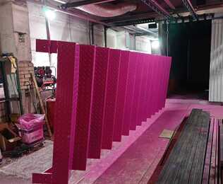 Порошковая покраска выполнена в камере 7×2,5×1,5 м с контролем толщины слоя и полимеризации. Перед окраской элементы были обезжирены, очищены и заземлены для равномерного напыления.