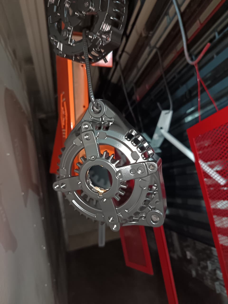 Осуществили порошковую покраску сложной металлической детали с развитой геометрией: множество рёбер жёсткости, отверстий и тонких перегородок.